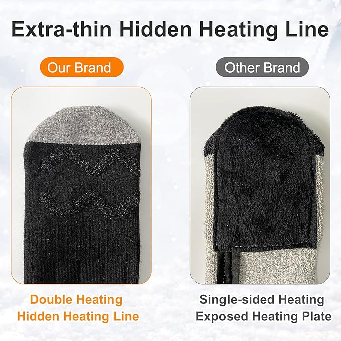 - 【Upgraded Heating Design】The heating element of this pair of socks has been upgraded to a carbon fiber line heating element, and the heating line has been hidden in the position of the forefoot and the back of the foot, your toes area will quickly warming up and keep your whole foot warm through the heat cycle when you wearing this winter warm socks.