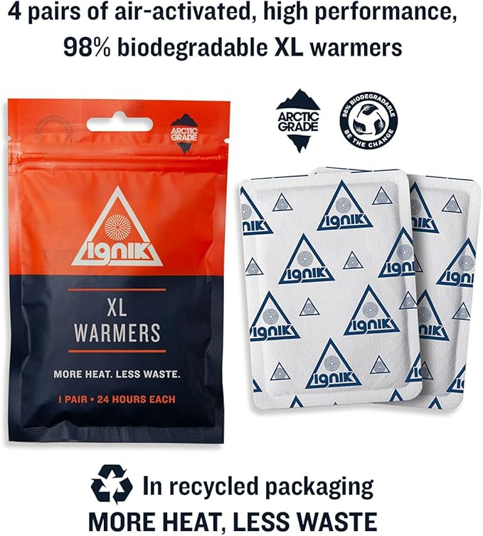 - 4 pairs of air-activated, high-performance biodegradable XL warmers, in recyclable packaging, for more heat with less waste