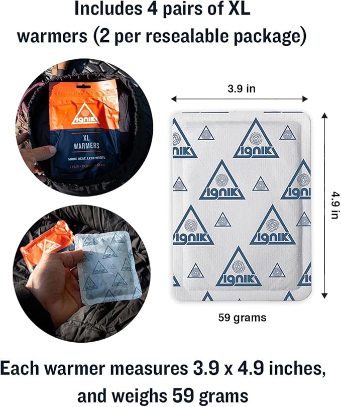 - Includes 4 pairs of XL warmers (2 per resealable package); each warmer measures 4 x 5.3 inches, and weighs 136 grams