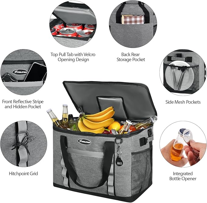 - UNIQUE DESIGN - Top pull tab with Velcro opening design, easy to access your food without having to open the zipper around the whole top cover, keeping contents cool/warm longer. Ergonomic design with two different ways to carry - adjustable straps and a carrying handle. An integrated bottle opener gives you a quick access to pop open a bottle of beer.
