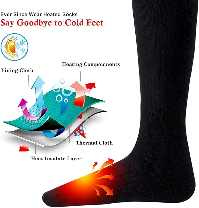 - Safe and Warm: Help those who have raynauds syndrome or chronic circulation issues, improve blood circulation and reduce soreness. Use carbon fiber heating elements that are durable, heat your feet effectively. Battery heated socks heat top foot, warmth quickly spreads around the entire foot.