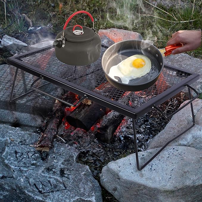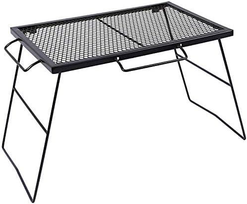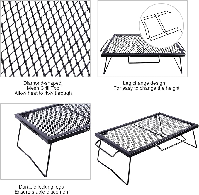 - Diamond-shaped Mesh Grill Top: The camping grill features a steel mesh grill top, which allows heat to flow through from a campfire below