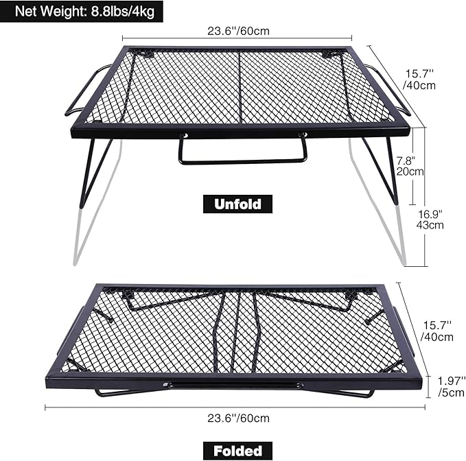 - Dimensions: Perfect fit on your campfire or fire pit to serve you delicious dishes. Unfold size is 23.6*15.7*16.9/7.8" /60*40*43/20cm, which can accommodate multiple pots and pans. Folded size: 23.6x15.7x1.97”/60x40x5cm, Weight: Weight: 8.8lbs/4kg