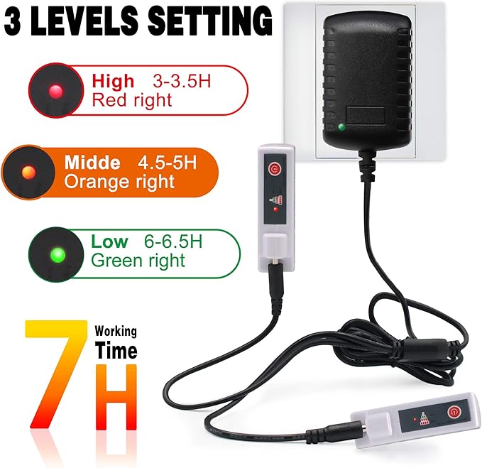 - 🔥3 Levels Setting Temperatures: Electric rechargeable heated socks powered by large capacity 3.7V/2200mAh Li-ion batteries. 3 levels temperature setting with long lasting hours, stay warmer work longer. 3 levels system: High (Red), medium (Orange) and Low (Green), winter warm socks can work up to 6.5hours after fully charged in the lowest setting, they can keep your feet warm all day .