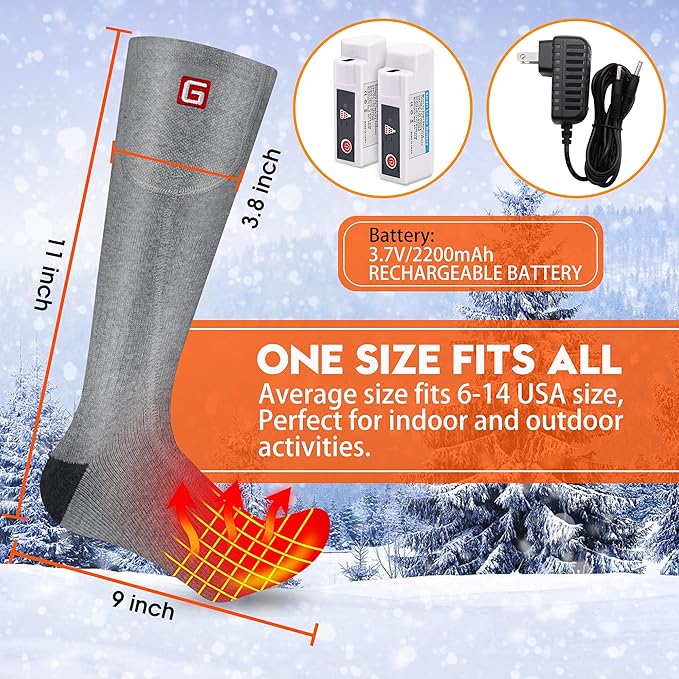 - 💞Women Men Heated Socks: Rechargeable electric thermal insulated heated socks are powered by a pair of 3.7V rechargeable li-ion batteries (include), heating temperature up to 125°f. three adjustable heat settings for different temperature demands. women heating socks feet warmers made from premium spandex fabric cotton, breathable, quick drying, heat insulated. Heated area:front instep. super elastic and stretchable for adults, men and women (6-14 usa size).
