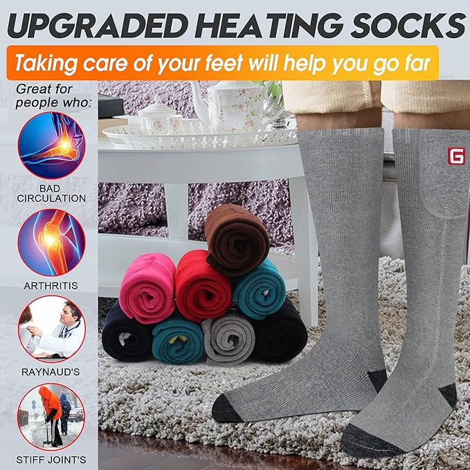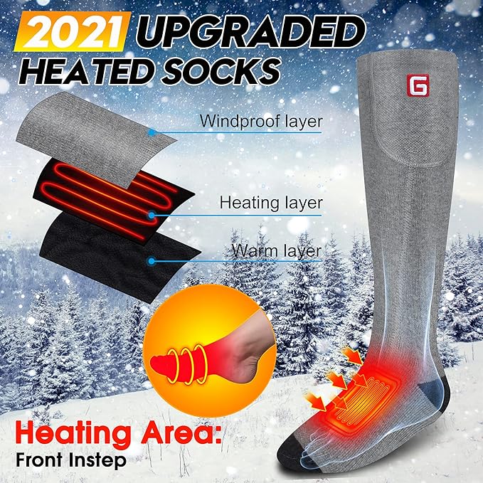 - ❄Safety & Improve Circulation: Rechargeable battery heated socks for chronically cold feet, good for blood circulation, keep you feet warm and comfortable all day, perfect for skiing, hiking, hunting, ice fishing, motorcycling, outdoor in the cold weather. winter warm socks is also good to health as heated socks to keep feet warm always and transfer the warm to whold body.
