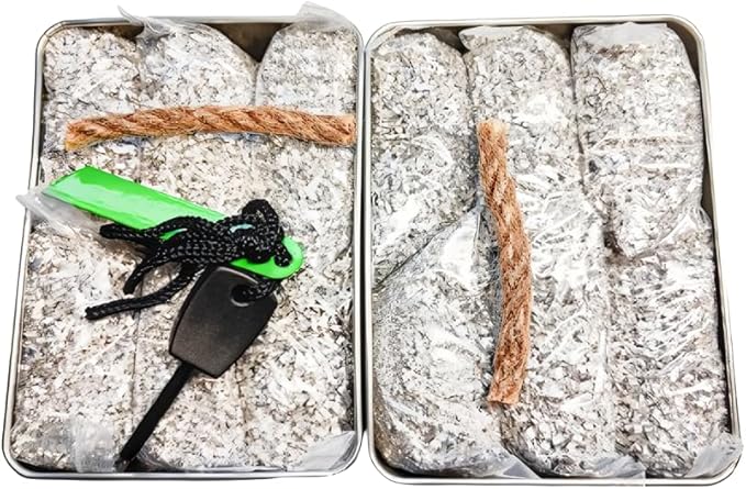 Emergency Fire Starter Magnesium 6 Bags Wax Infused Jute Rope Ferro Rod Striker Saw Wire for Camping Hiking Bushcraft Hurricane + Tin Container