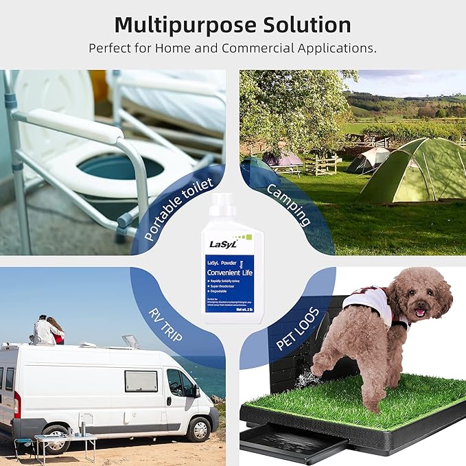 - Wide Application: Solidifier Powder is ideal for camping and hiking portable toilets, bedside toilets, dog grass mats with trays, pet toilets, cat litter boxes, portable pet potty trainers and more. In emergencies or anywhere away from modern conveniences, camp toilet chemicals will get through emergencies