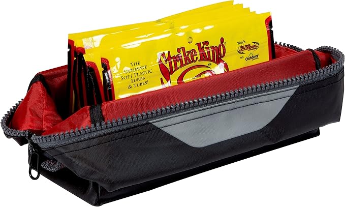 - WATER-RESISTANT TPE COATED FABRIC keeps your soft plastics in pristine shape. Features heavy-duty molded zipper, durable carry handle, and KVD Signature design elements. Black with red interior and stitching. Dimensions: 9”L x 4.5”W x 6”H.