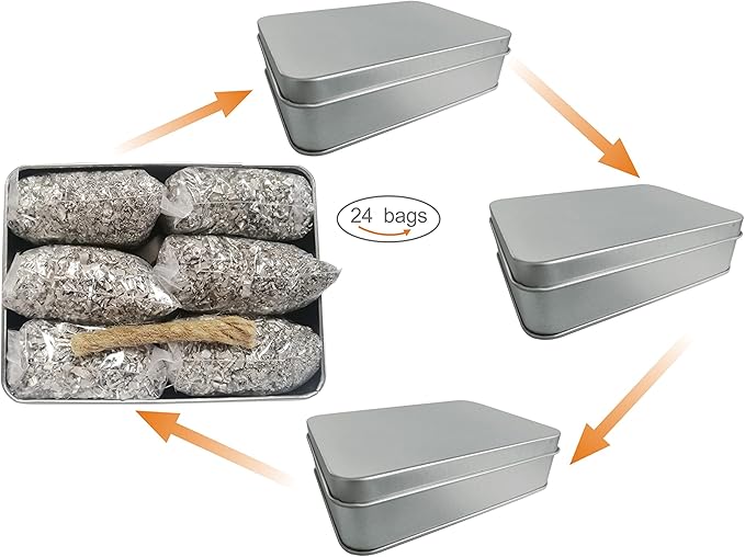 - 24 resealable zip closure bags, each bag is packed full of shiny new shaved, shreds, chips, spiral magnesium without oxidation, the bag is 3 1/6 x 2 1/2 inch.