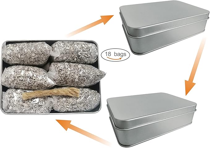- 18 resealable zip closure bags in 3 of free tin container, each bag is packed full of shiny new shaved, shreds, chips, spiral magnesium without oxidation, the bag is 3 1/6 x 2 1/2 inch.