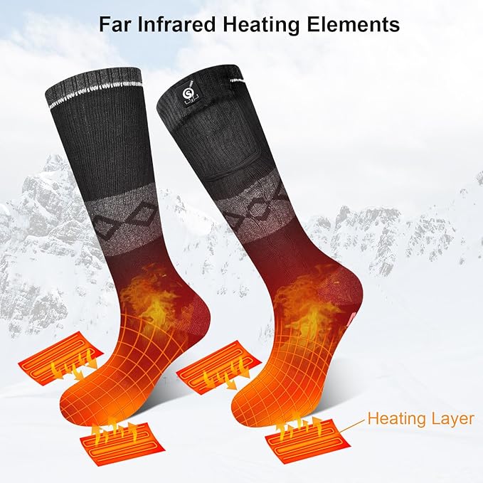 - 【Heating Elements Covers Instep and Toes Area】Upgraded heated socks to use fiber heating elements all around both fore foot and instep. Great for cold feet.Give you a warm winter!
