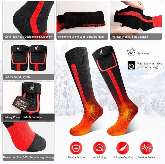 - 【Heating Elements Covers Instep and Toes Area】Upgraded heated socks to use fiber heating elements all around both fore foot and instep. Great for cold feet.Give you a warm winter!