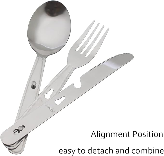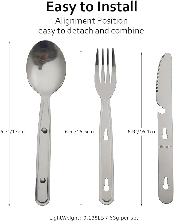 - Easy to Carry: These camp utensils stack 3 units together after using, make sure snap button closure. This Portable set packs small, making it easy to carry, and at only 63g / 0.14lb, is lightweight.