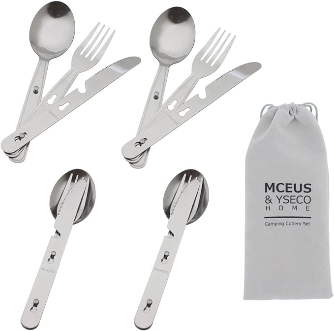 4-in-1 Camping Utensils Hiking Cutlery Set for 4, Portable Stainless Steel Flatware Spoon Fork, Knife & Bottle Opener Combo pack for Picnic Travel, Barbecue, Backpack Outdoor Gear with Carrying Bag