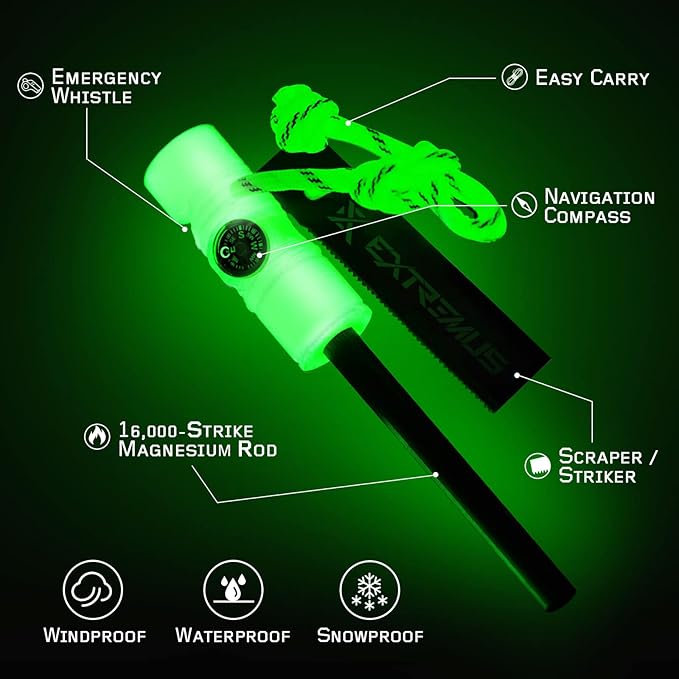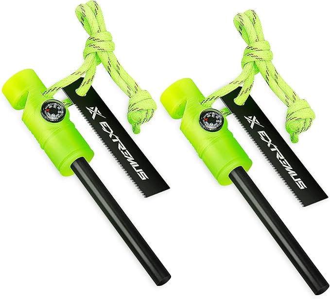 - 6-in-1 Emergency Multi-Tool – The new Extremus 6-in-1 Emergency Multi-Tool is a must have for every camper, hiker, hunter and anyone who spends time in the outdoors. This two pack set includes the high-temperature magnesium rod (2), Steel Striker (2), Built in Compass (2), Emergency Whistle (2) and two lengths of paracord. Fire Starter with Carabiner Survival Tool included one Fire Starter and our patent pending Paracord Carabiner tool.