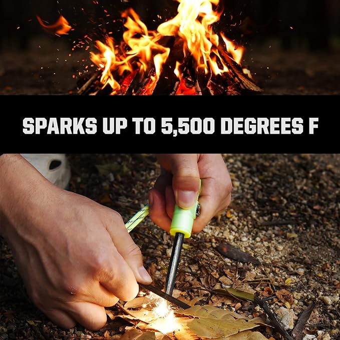 - High-Temp Magnesium Rods – The magnesium rods will provide thousands of strikes to start fires in almost any condition. They provide sparks as hot as 5,500 Degrees F to easily start fires in extreme conditions. Sharply strike the included steel strikers against the rod to generate sparks in the direction of kindling and fire-starting material. There are two magnesium rods included in this kit so you can always have one handy while in the outdoors.