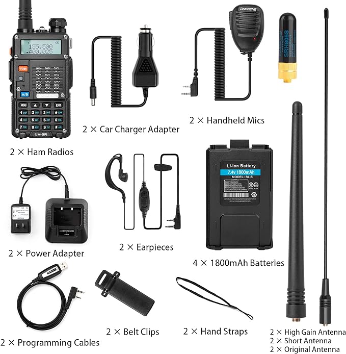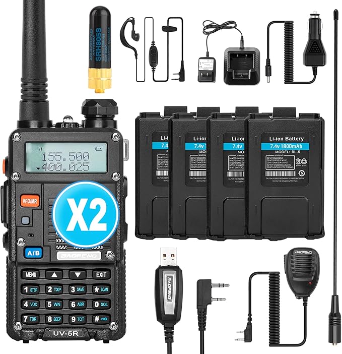 Ham Radio, BaoFeng UV-5R Pro 8W Walkie Talkies, Handheld Dual Band Two Way Ham Radios Long Range with Rechargeable Battery, Earpieces, Mic, Antenna and Programming Cable (2 Pack)