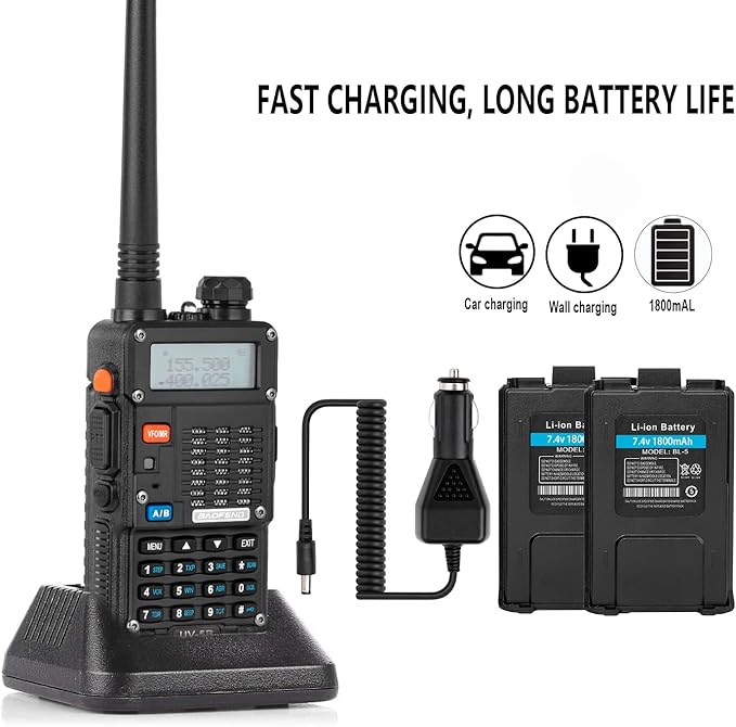 - Long battery life: Each hand held ham radio comes with 2 × 1800mAh rechargeable Li-ion batteries for continuous use. Low battery warning reminds you of charging or replacing the battery. It takes 3 hours to fully charge. Car charger adapter included