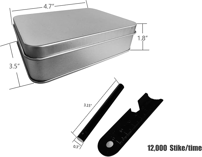 - With the size of 4.7 in long 3.6 in wide and 1.8 in deep, the tin container keeps magnesium away form children, pets, fire, water, etc. Safe and Easy to store and carry in your backpack,BOB, survival kit or car.