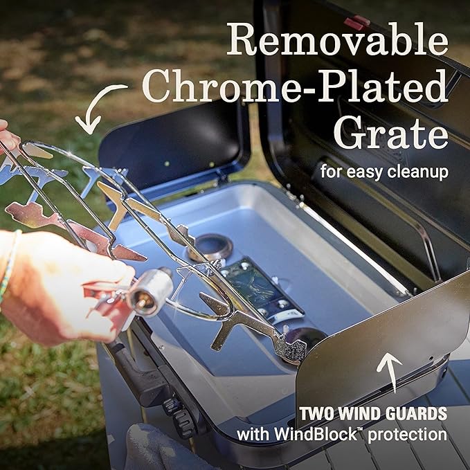 - WindBlock panels shield burners from wind or fold down for use as side tables
