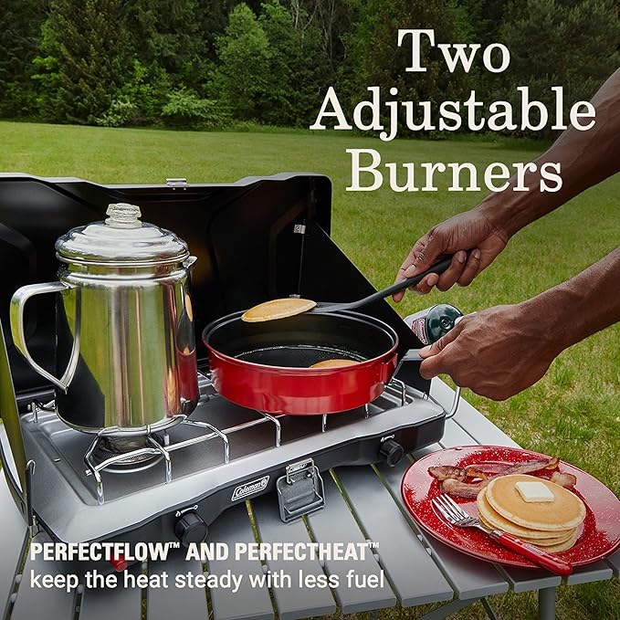 Coleman Triton+ 2-Burner Propane Camping Stove, Push-Button Instant Ignition, Portable Camp Grill, Adjustable Burners, Wind Guards, 22,000 Total BTUs of Power, Beach Cookouts, Backyard BBQ, Tailgating