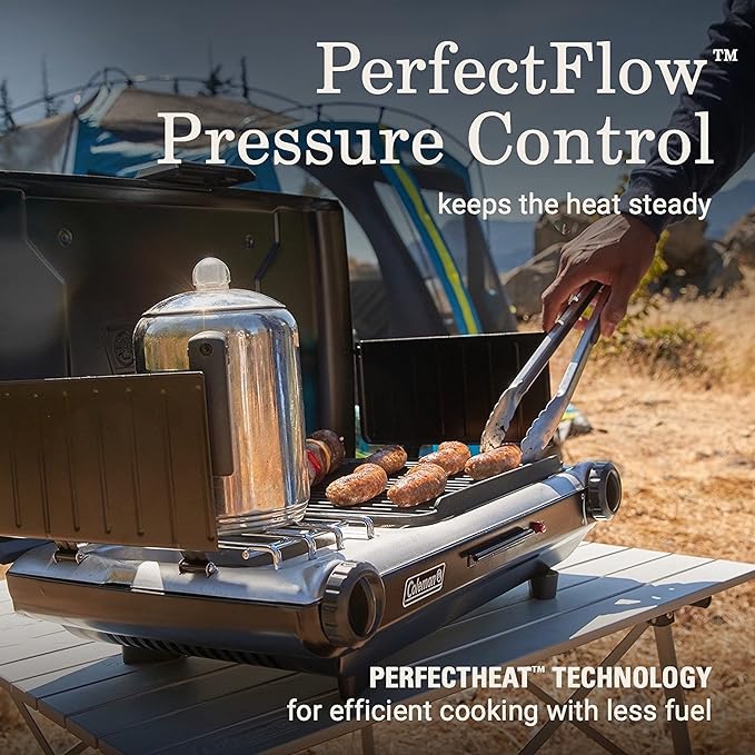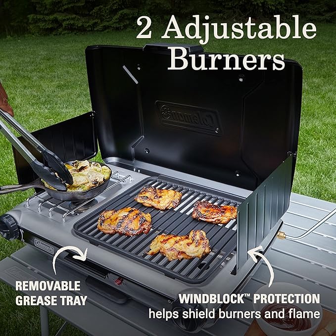Coleman Tabletop 2-in-1 Grill & Stove with 2 Adjustable Burners, Propane Grill/Stove with Push-Button Starter, Wind Guards, Grease Tray, & 20,000 BTUs of Power for Camping, Tailgating, & More