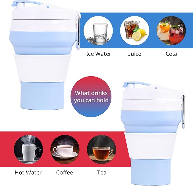 - [Safe Material Food Grade Silicone]- Our collapsible travel cup made of food grades silicone, No BPA. It added a anti-scald ring for safety. Besides. It is easy to clean, no smell, durable, flexible & reusable, withstands temperature of -104℉ ~ 428℉.