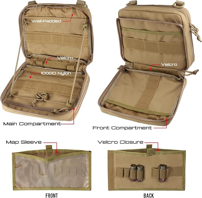 - OPEN FLAT TO QUICK ACCESS: Tactical Admin Pouch's main compartment can open flatly to let you work in a desk setup, you can hold in any position with the edge-to-edge retention cord. Two side retention straps for quick access to the pouch without full-opening.