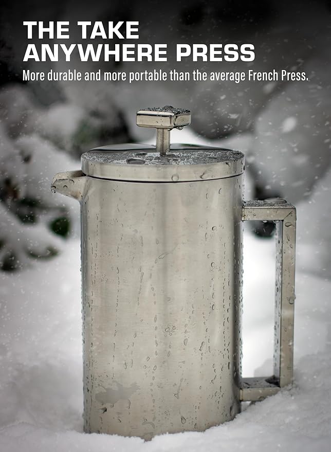 - LIFETIME REPLACEMENT GUARANTEE: This large camping coffee press is made of AISI 304 stainless-steel with the same 14-gauge industry standard material used for building construction – a metal French Press coffee maker built to last