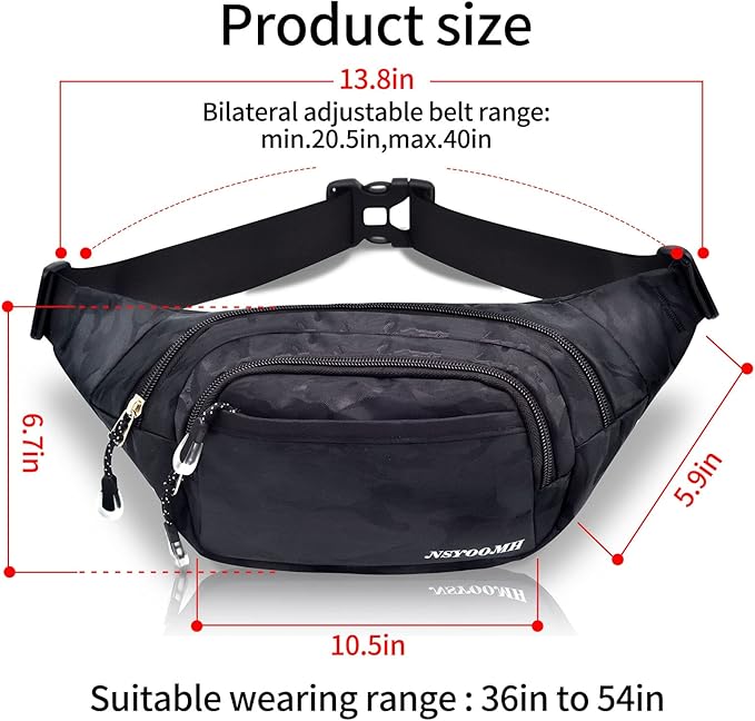 - Bilateral Adjustable Bumbag:NSYOOMH hip pack wearing range from 36" to 54" ,Easily and quickly adjust to the length you need Keep the length you chosen without loosening.