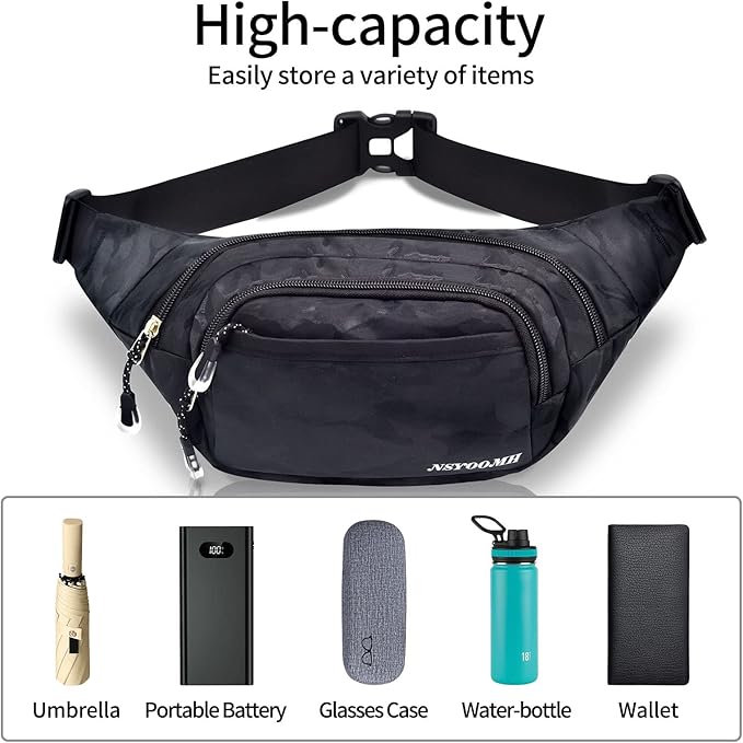 Fanny Pack for Women & Men, 5-Zipper Pockets Water Resistant Practical Waist Bag, for Outdoor Running Cycling Sports Travel Hiking Fishing Fashion Camo Black Belt Bags