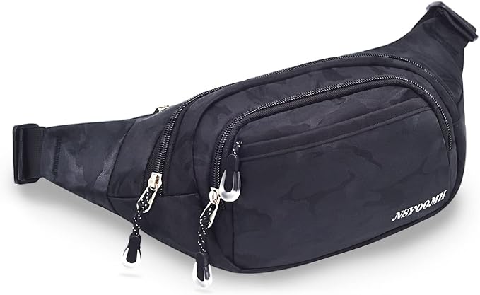 Fanny Pack for Women & Men, 5-Zipper Pockets Water Resistant Practical Waist Bag, for Outdoor Running Cycling Sports Travel Hiking Fishing Fashion Camo Black Belt Bags
