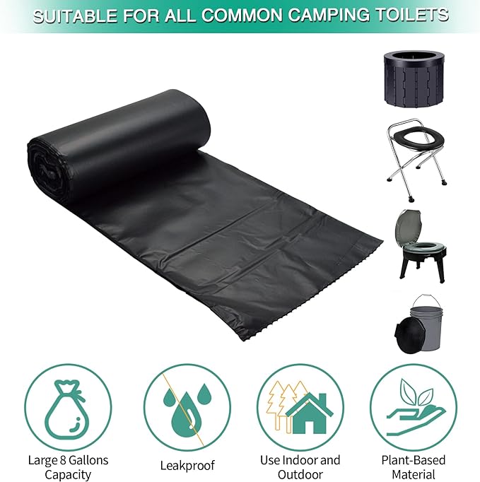 - 🌱[MATERIAL] - Our compostable portable toilet bags are made from plant-based materials that break down and easily decompose in 180 days when placed toilet waste bags in a compost environment. Leaving H2O,CO2 and humus which are Long-lasting and nontoxic.