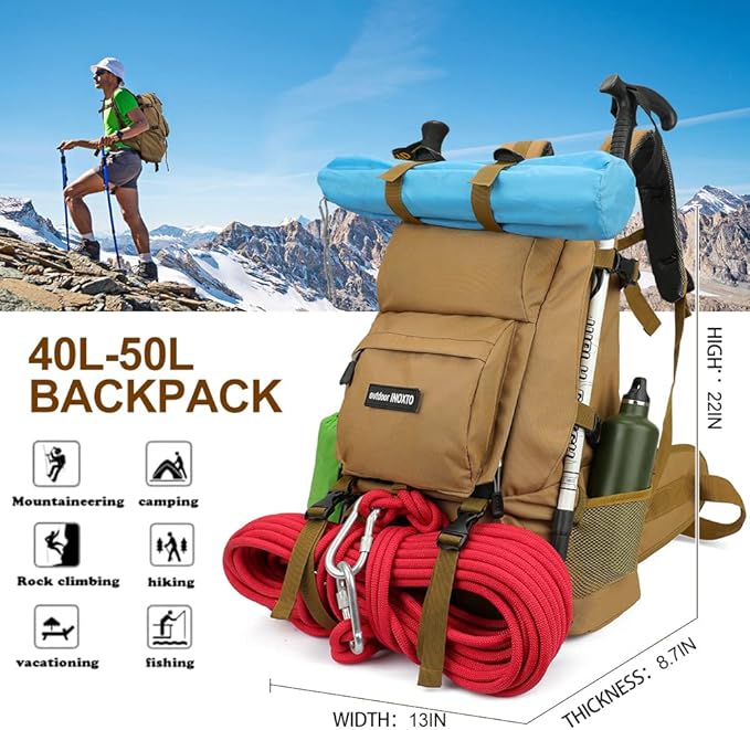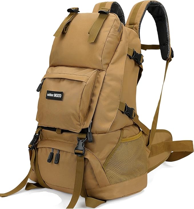 INOXTO 40L Hiking Backpack with Waterproof Rain Cover, Khaki, Unisex
