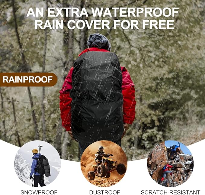 - 🕐【HIGH QUALITY & DOUBLE WATERPROOF BACKPACK】: Our INOXTO Hiking Backpack is made of sturdy ripstop water-resistant Polyester Material. KAM zippers - durable zipper, well-sewn craftsmanship, high dense stitching. Built with strong stitching in the places you need it such like the shoulder straps, carrying handle, bottom and other places. With waterproof rain cover for free prevents your outdoor gear from getting wet in drizzle, not afraid the rain anymore.