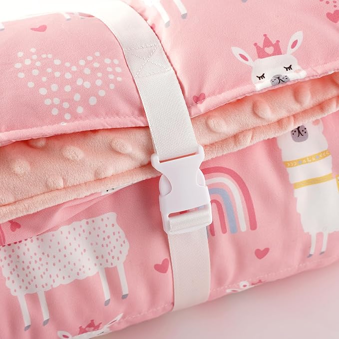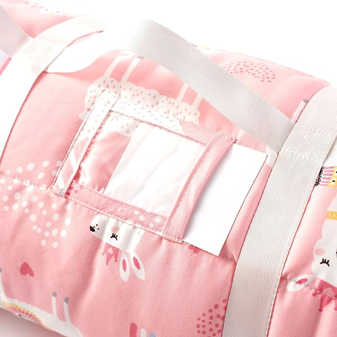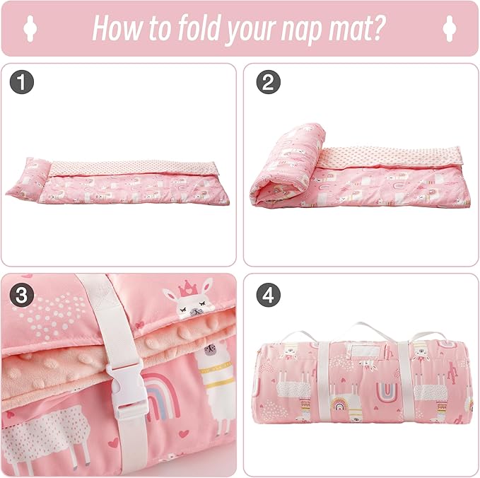 - CONVENIENT FEATURES: Designed to roll-up, velcro close, and carry away with a handle, this nap blanket with pillow is easy to carry to daycare, school, on playdates, or on trips. Our padded nap mat is a toddler and baby essential.