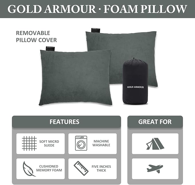 - COMFORTABLE: Our Gold Armour pillow is stuff with cushioned memory foam and wrapped in a soft, micro-suede cover. This travel pillow gives you a well deserved supportive rest that your head and neck will thank you for! Our compressible pillow can also be used as a seat cushion too