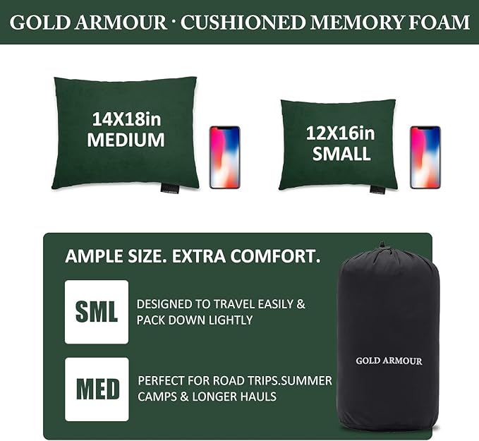 Gold Armour Camping Pillow Memory Foam - Compact Compressible Backpacking, Hammock, and Travel Pillows for Kids and Adults - Essential Outdoor & Camping Gear (Small 12 x 16in, Green)