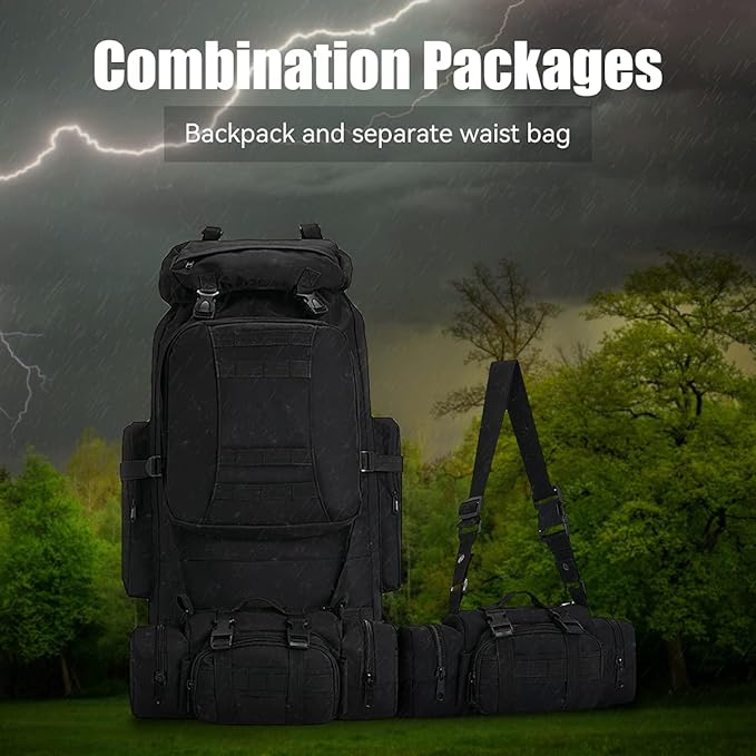 - 【Hiking Backpack and Waist Bag Size】: This waterproof lightweight hiking backpack size 15.35 * 8.66 * 31.49 inches (L x W x H), mountaineering backpack weighs only 3.63 pounds / 1.64 kg, carrying waist bag size 15.74 * 3.93 * 6.69 inches (L x W x H) waist bag only It weighs 0.99 lbs/0.51 kg and will not add burden to your travel.The military tactical bags is suitable for camping, hiking, hunting, camping, climbing. It can replace a suitcase.