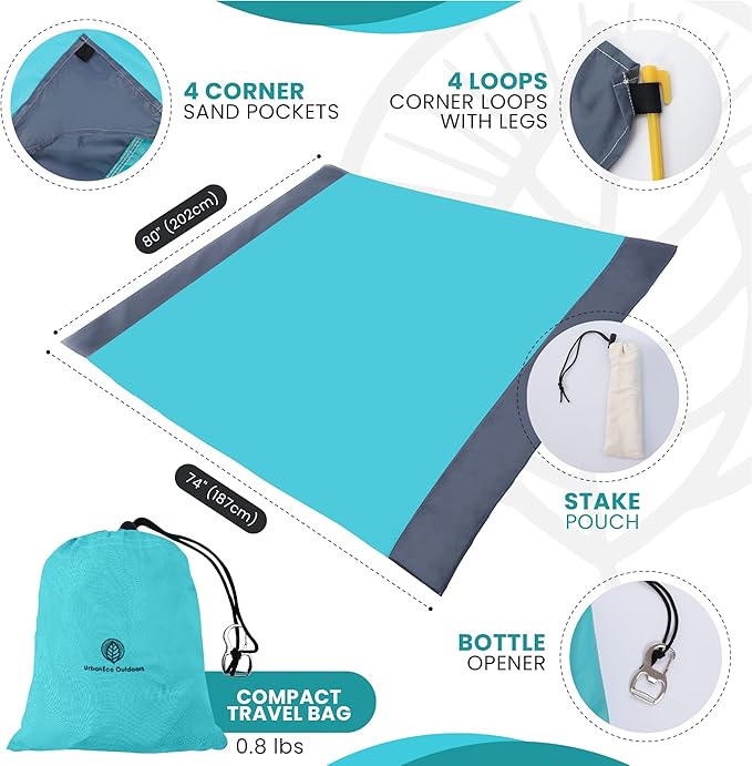 - Large Size For Up to 6 People: It's an extra large beach blanket (80”x74”), but it's also easy to stow away. Our beach mat sheet rolls into a compact size that fits in its storage sack. It's a lightweight and packable outdoor blanket, so you'll have no problem tossing it in the trunk for your next trip! The large area of this folding mat makes ideal outdoor play mat or portable camping mat for the family.
