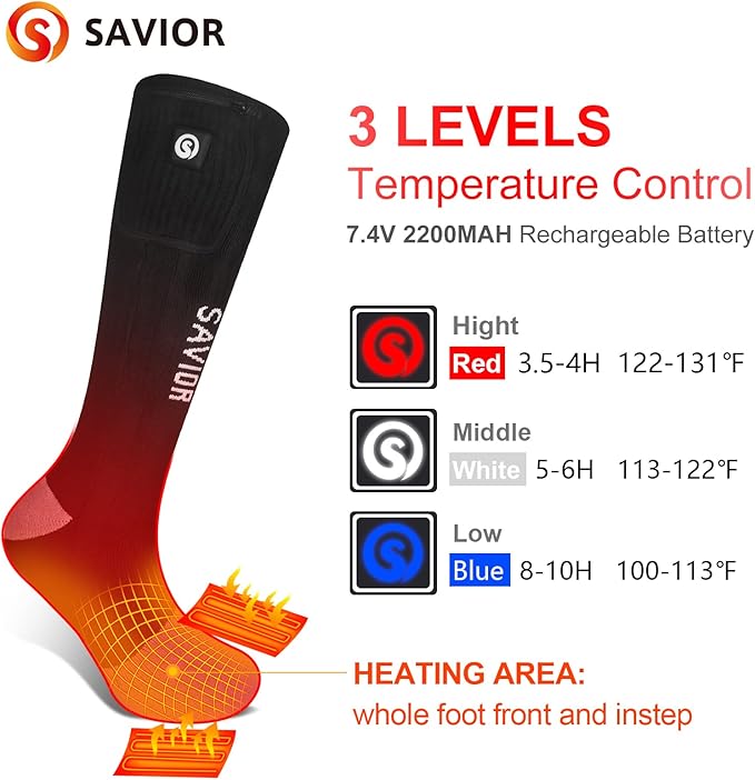 - 【7.4V 2200MAH Rechargeable Li-ion Batteries&Long Heating Hours】The Upgraded heated socks includes a pair 7.4V 2200MAH Li-ion rechargeable batteries. Battery full charge around 3-4 hours. Long-lasting heating, long life batteries, no longer afraid of the cold.