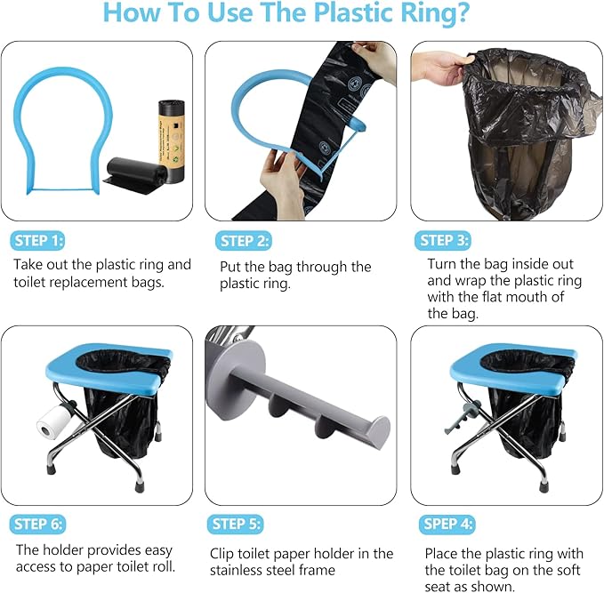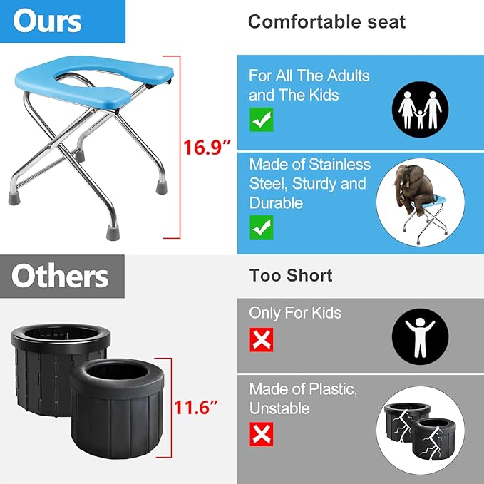 - 【Multi-Functional】This is a perfect portable folding toilet and portable chair, it can be used as portable toilet and chair for car, camping portable potty, portable seat, also can use as trash can, small stool, indoor toilet for the elderly etc. Applied to traffic jam, long road trips, camping, traveling, hiking, fishing, boating, beach, outdoor living, construction sites etc anywhere anytime for emergencies.