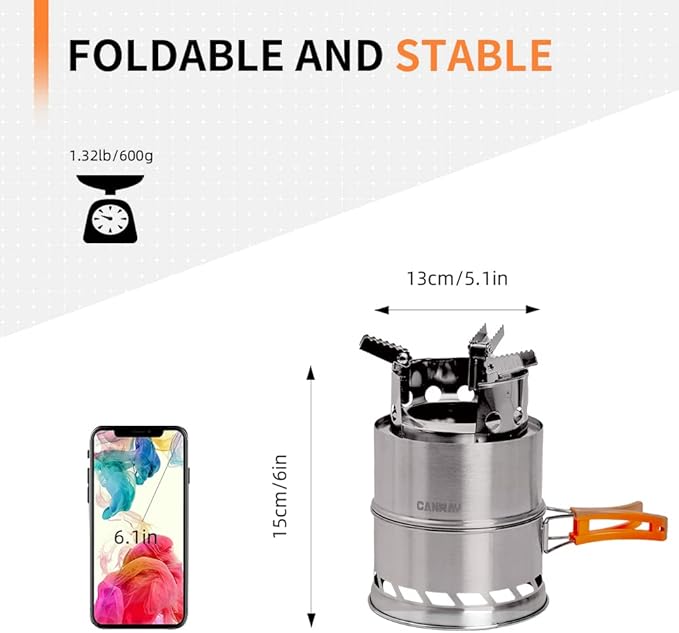 - 🔥High Thermal Efficiency: The secondary combustion keeps camping wood stove burning continued for 20mins with dry firewood and wood chips.