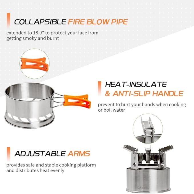 - 🔥Environmentally Friendly: With no fuel canisters or alcohol needed, we’ll be leaving no chemical emissions behind. The camp stove use branches, leaves, woods as fuel which is easy to get anywhere.