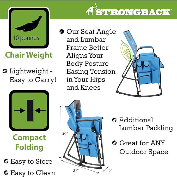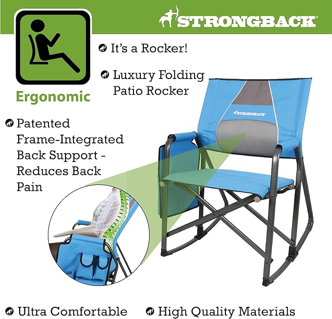 - The difference? All STRONGBACK folding patio and camp chairs have our award-winning, patented ergonomic design built into the frame of the chair itself. This design better aligns your body posture easing tension; with lumbar support for your back and a special seat designed to prevent leg pinch and align the hips. This system provides maximum comfort and relaxation