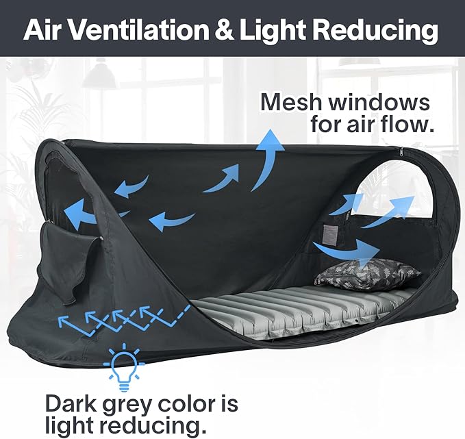 - ◆𝐇𝐢-𝐥𝐢𝐠𝐡𝐭𝐬: innovated design pop up automatically, no assembly needed. Only one flexible ribs frame makes it lightest bed tent on the market, only 3 lbs. Measurement, 79"L x 28"W x 28"H, is customized for one person laying down (not sitting). Create a cozy relaxing & sleeping privacy area in office or dormitory. Need no heavy mattress or attached to bed frame. A second to fall asleep! Full energy recovery!