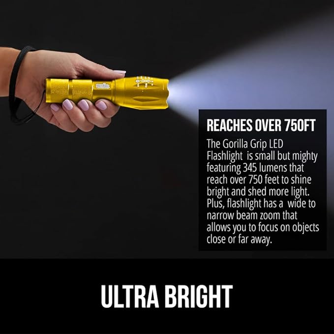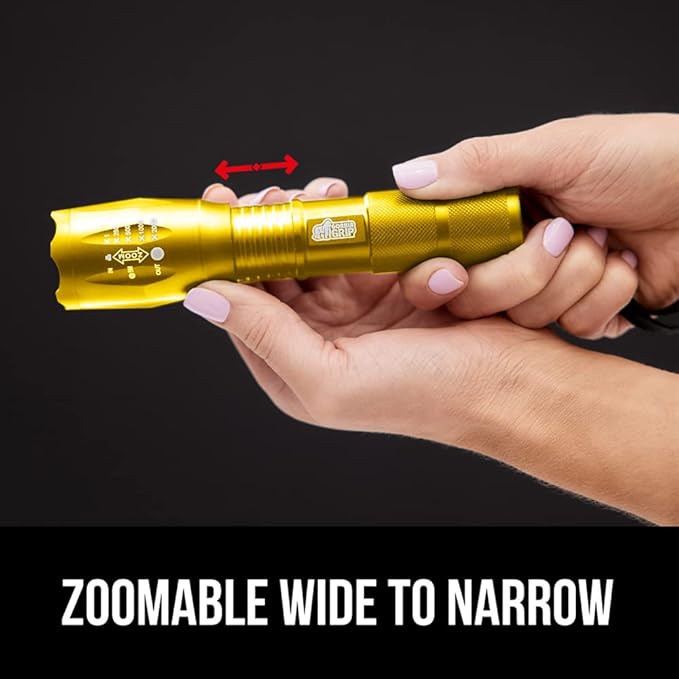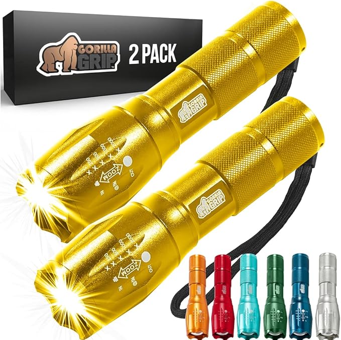Gorilla Grip Powerful LED 750 FT Water Resistant 5 Adjustable Mode Tactical Flashlight, High Lumens Ultra Bright Battery Zoom Flashlights, Small Camping Car Mini Flash Light Accessories, 2 Pack Gold