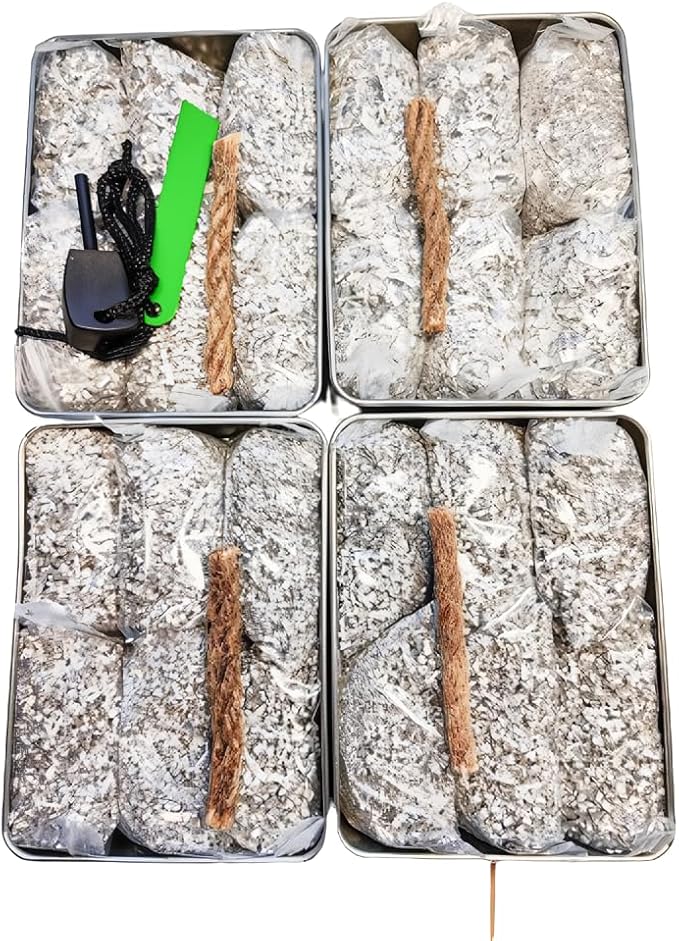 Emergency Fire Starter Magnesium 6 Bags Wax Infused Jute Rope Ferro Rod Striker Saw Wire for Camping Hiking Bushcraft Hurricane + Tin Container