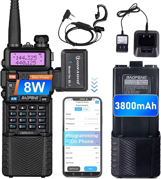 Baofeng UV-5R Ham Radio Handheld High Power Two Way Radio 3800mAh Battery Walkie Talkies with Earpiece and TIDRADIO Wireless Programmer Adapter Support Phone APP Program